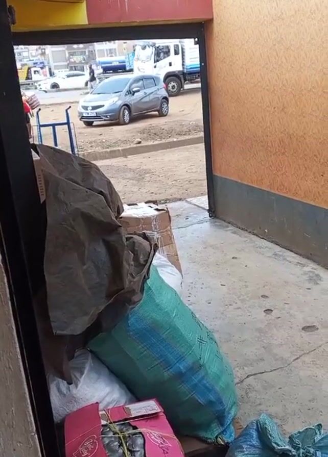 interior of a building looking out onto a street scene. The main focus is on a collection of packages and bags stacked on a wooden pallet just inside the doorway. These include a brown tarp-covered package, a blue-green sack, a pink box tied with twine, and other white sacks. Outside, the street is visible with cars passing by and a large white truck parked nearby. The building has a concrete floor inside and the walls are painted in brown and beige.