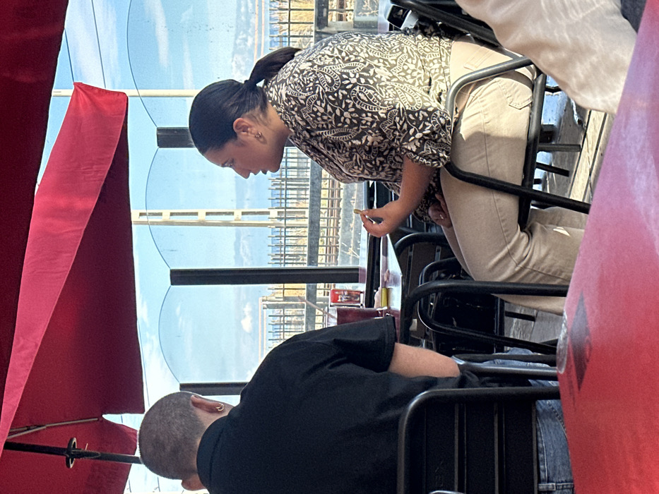 The image captures two individuals seated at a dark-colored table within an outdoor dining area, sheltered by a red awning or umbrella