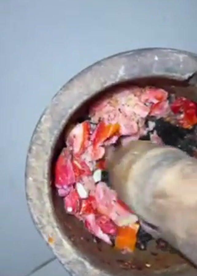 someone using a wooden pestle in a stone mortar to grind ingredients. The ingredients include chopped tomatoes, garlic, and other red and orange components. The mortar is well-worn and sits on a grey tiled floor. The pestle is being used to crush and mix the ingredients into a paste.