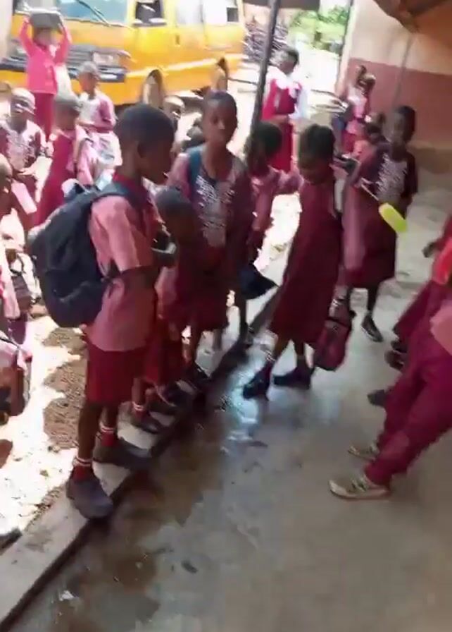 A group of school children, most wearing red and pink uniforms, some with backpacks, stand outside a building. A yellow van is parked in the background. Some children are standing on a wooden plank. One child is carrying a bucket on her head. A person in a blue and white striped shirt stands at the far left of the frame. The children appear to be excited. Someone says, "Yes, we're all going for weekend. Make sure you read your book when you get home".