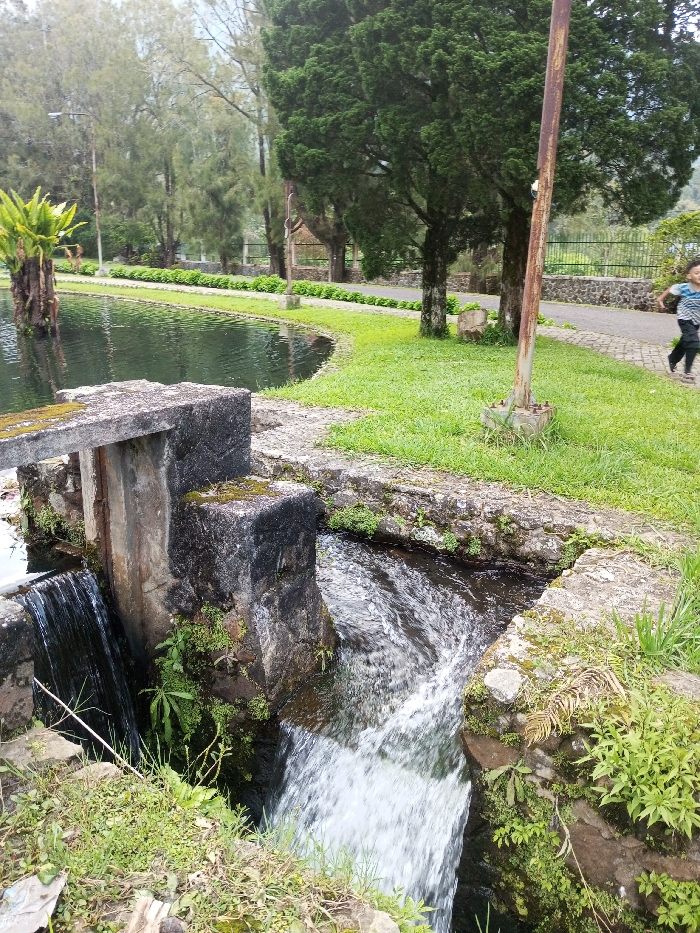The scene, located in Ambositra, Madagascar, depicts a landscaped area featuring a water management structure and pathway. In the foreground, a concrete and stone weir channels water. Water cascades vertically from a still pool on the left into a lower culvert, while a turbulent stream flows over a shallower section to the right. Moss and small green plants adhere to the wet stone surfaces of the structure. To the left, a dark, calm body of water, likely a pond or lake, contains a prominent plant with large, frond-like leaves rising from its surface. To the right of the water structure, a manicured grassy area abuts a paved pathway bordered by a low, trimmed hedge. On this pathway, a young male individual, wearing a striped shirt and dark trousers, is depicted in motion, appearing to run from right to left. A rusty metal pole, anchored by a concrete base, stands in the grassy area near the path. The background is dominated by a dense line of tall trees, including coniferous species, situated behind the pathway, with a metal fence visible beyond them, extending into the distance under a diffused sky.