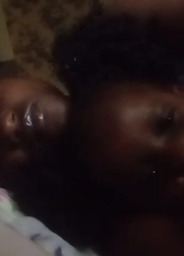 Two young black girls are lying on a bed together in a dimly lit room. They are close to each other, almost cuddling. One girl is looking at the camera with her eyes open, and the other girl seems to be sleeping or resting with her eyes closed. The room is dark, with minimal lighting. There is a patterned wallpaper in the background and a few objects are visible on a surface behind the girls. The focus of the video is on the faces of the two girls.