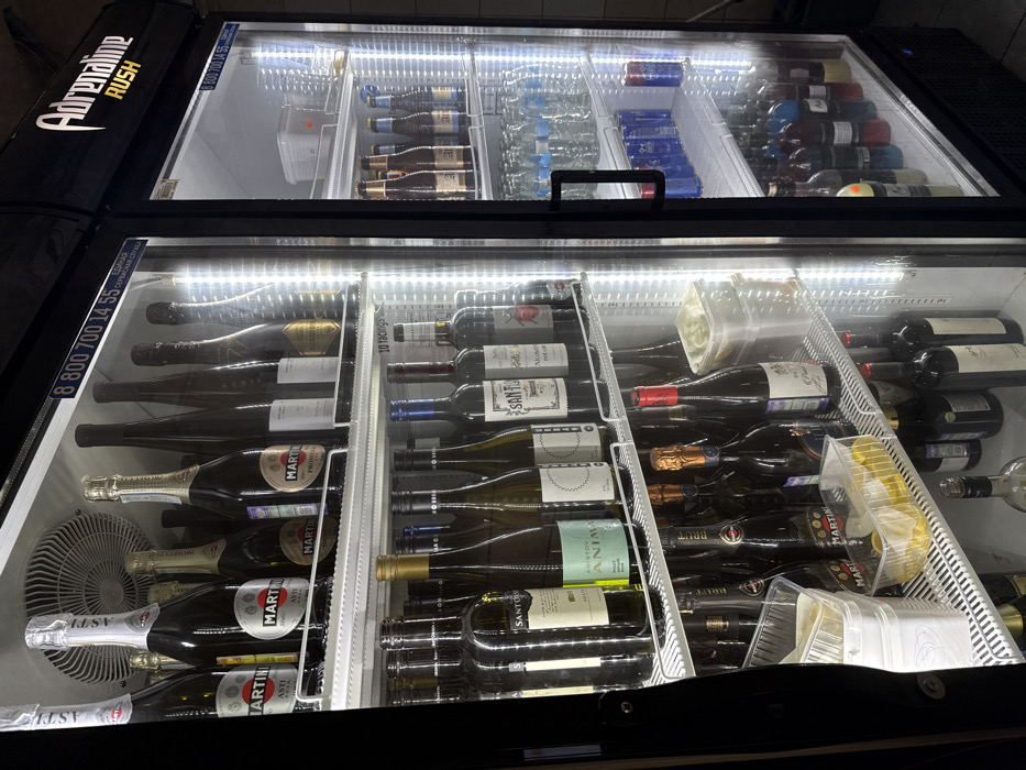 The image displays two brightly illuminated commercial display refrigerators with glass doors, situated within a commercial establishment in Moscow, Russia
