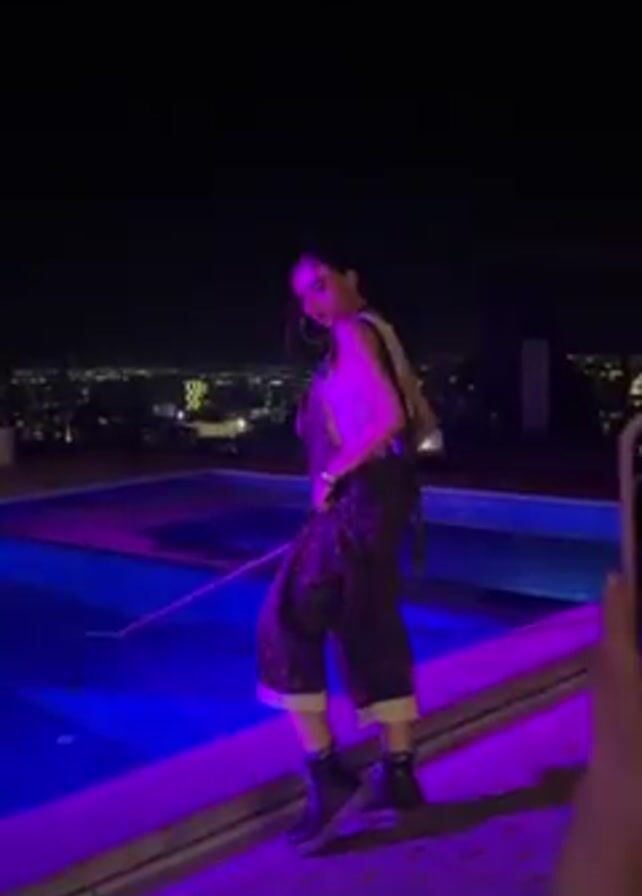 The video depicts a young woman dancing in front of a pool at night. She is wearing a white tank top, patterned overalls rolled up at the cuffs, and dark boots. Her hair is pulled back. The pool is illuminated with blue lights. The surrounding area is paved with pink brick. In the background, a cityscape is visible. A person holds up a phone to record the woman dancing.
