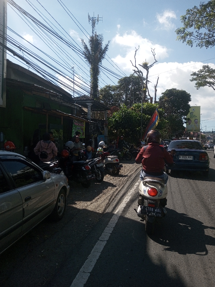 - "The image depicts a bustling street scene in Indonesia, identifiable by visible Indonesian license plates (B 3326 KBL and F 4788 WAL) and a political billboard for "PARTAI GOLKAR"" by FM-I50SD3, licensed under CC BY 4.0