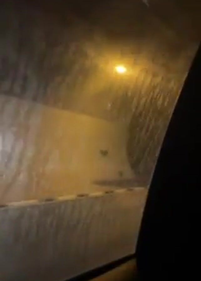 A car is driving through a tunnel at night. The view is from inside the car, through the window, showing the tunnel walls and the road passing by. The car's exterior is briefly visible. There is a light inside the tunnel.