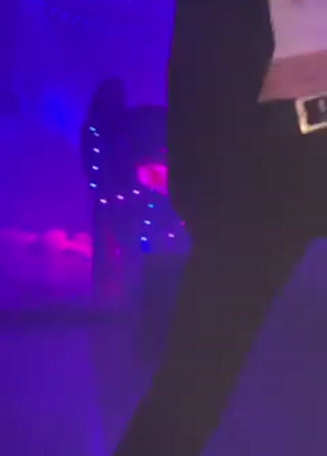 A young woman dances at what appears to be a party or event. She is wearing a white top under a dark-colored blazer with black pants, and has long hair pulled up in a ponytail. She also carries a beverage in her hand. The room is lit with blue and purple lights, and appears to have string lights on the ceiling. There are other people present in the background, including one person who is seated at what may be a keyboard or other musical instrument. The dance floor is reflective.