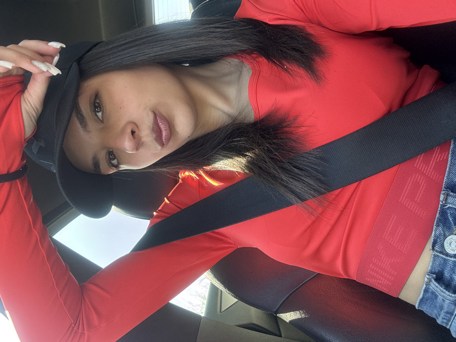 A young female is positioned in a close-up, chest-up shot, seated within a vehicle located in the city of Kostandovo, Bulgaria. She has dark, straight hair, worn down to her shoulders, and is wearing a black baseball cap, a long-sleeved red crop top featuring a red elastic waistband with visible "IKE PRO" text, and blue denim jeans. A black seatbelt is diagonally secured across her chest, from her right shoulder to her left hip. Her right arm is raised, with her hand making contact with the brim of her cap. Her fingernails are long and appear to be lightly colored. She is looking directly at the viewer with her lips slightly puckered. Bright sunlight enters from the upper left, illuminating the subject and the interior of the vehicle, which features black upholstery. The exterior background through the vehicle's window is blurred, indicating an outdoor setting with daylight.