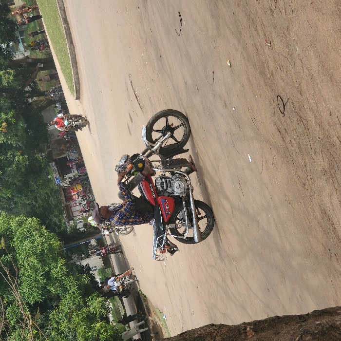 The scene depicts a street in Ihiagwa, Nigeria, characterized by a predominantly unpaved, sandy-brown road surface. In the midground, an adult male wearing a blue, black, white, and red plaid long-sleeved shirt, dark trousers, and a light-colored baseball cap is seated on a red Daylong CG-150 (or CG-125) motorcycle. His bare feet are visible near the ground as he holds the handlebars. The motorcycle features chrome accents on its exhaust, handlebars, and a rear luggage rack. To the immediate left in the foreground, part of a tree trunk is visible. The road exhibits tire tracks and scattered small debris. In the background, lush green trees with dense foliage are prominent, partially obscuring a white building on the left. Several individuals and additional motorcycles are visible further down a side road to the left. To the right and in the far background, a raised circular median, covered with grass or low vegetation, marks what appears to be a roundabout or intersection. Multiple pedestrians and other motorcyclists are present around and beyond this median. A motorcyclist wearing a red shirt is seen on a paved section of the road approaching the median. A building with a blue facade and a small red sign is visible beyond the roundabout. The sky is bright, indicating daytime conditions.