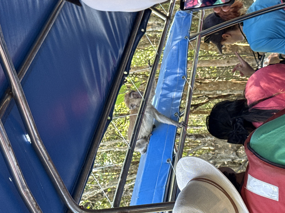 A monkey clings to the side of a boat, gripping a blue support bar. The boat has a blue canopy and metal framework. Tourists are aboard, including a person in a blue shirt pointing with their finger and a woman in a hat. The background shows a mangrove forest. The scene is captured from a slightly tilted perspective.