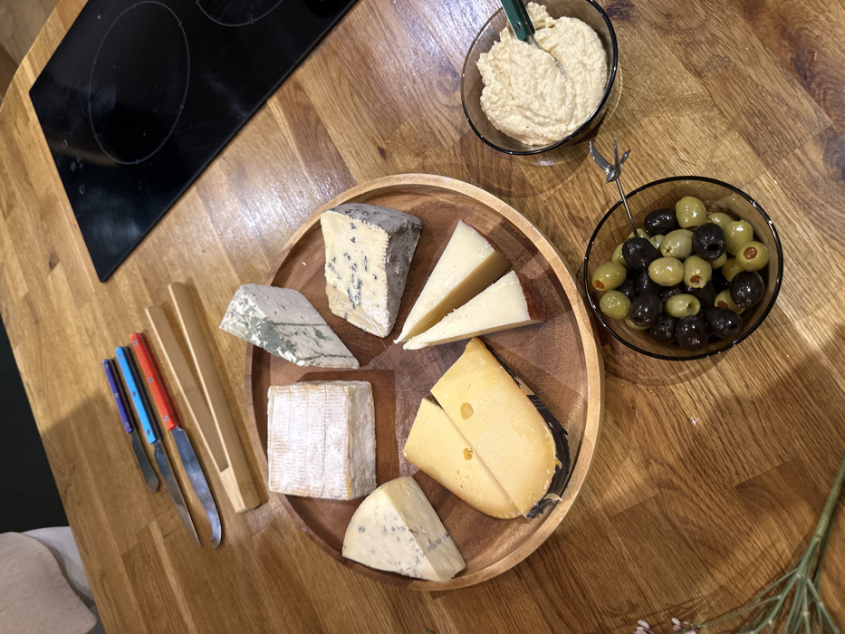 A wooden table displays an assortment of cheeses on a circular board. Blue cheese, brie, and Swiss cheese are visible, alongside colorful cheese knives and wooden tongs. Next to the cheese board are bowls of hummus and olives. A black stovetop is also seen in the upper left corner.