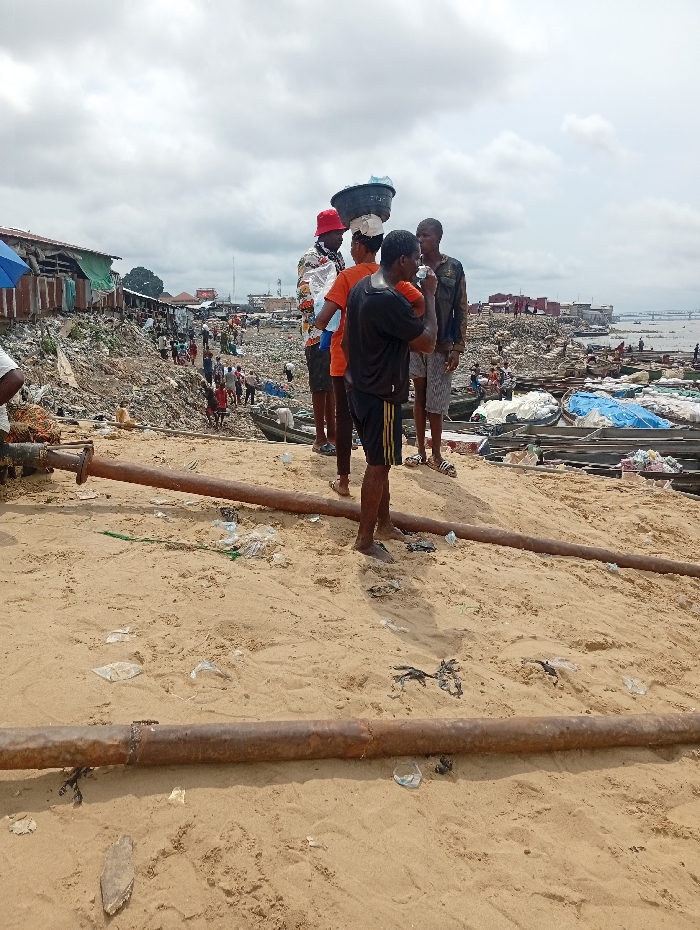 A group of men stands on a sandy beach littered with trash. One man balances a basket on his head, another wears a bright orange shirt and a third is drinking. Large metal pipes lie on the sand in the foreground. In the background, a shanty town sprawls along the water's edge, with boats dotting the shoreline. The sky is overcast and the scene appears to be in a state of disrepair and poverty.