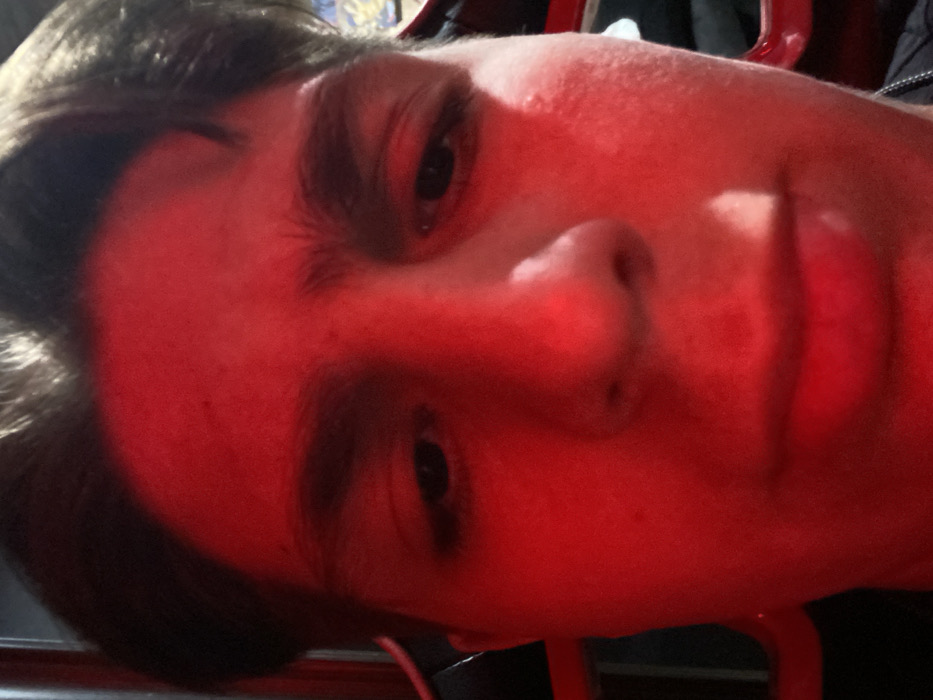 A close-up selfie of a person's face bathed in a strong red light