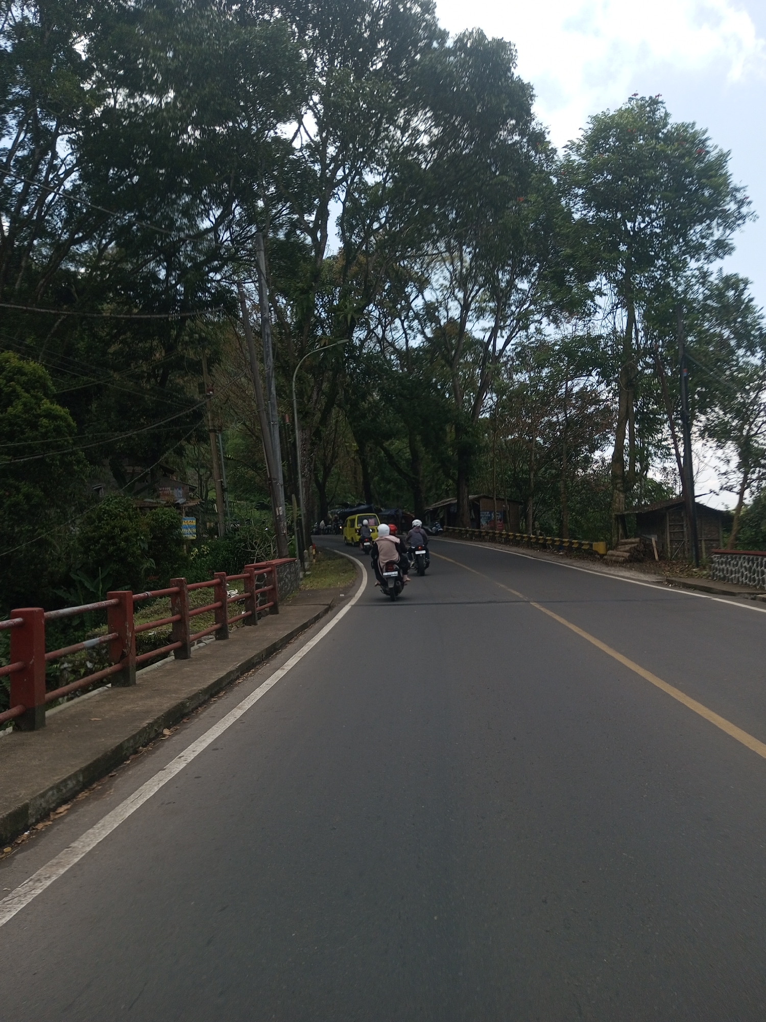 The image depicts an asphalt road with a solid yellow line marking the center. On the left side of the road is a low concrete barrier with a red metal railing. Beyond the barrier is a densely wooded area. On the right side of the road, there are scattered trees and small wooden structures. Two motorcycles are traveling along the road, with a yellow vehicle visible further ahead. The scene is set in a natural environment, with large trees lining both sides of the road, suggesting a location outside a typical urban center. The sky is visible through the trees. The image does not offer specific details to confirm the exact location as the city of Nawng Hkar, Myanmar.