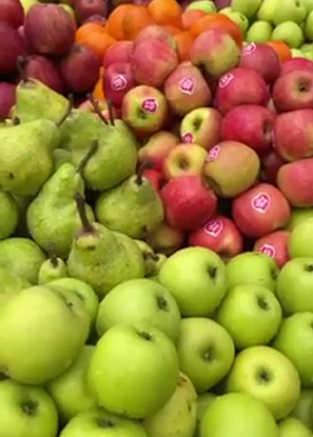 colorful display of fresh fruits at a market. A large pile of green apples dominates the lower portion of the frame. Above them are green pears with stems, followed by a layer of red apples, some with heart-shaped stickers. Above the red apples are oranges, and then a layer of darker red fruit. In the background, there is indistinct human activity and sounds suggestive of a crowded market environment. The fruit is brightly lit, and the overall impression is one of abundance and freshness.