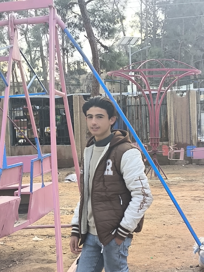 A young male, appearing to be in his late teens, stands facing slightly right of the viewer, looking directly at the camera with a subtle smile. He has dark hair, a light complexion, and a faint mustache. He is wearing a brown hooded puffer jacket with white sleeves, a white fleece lining visible, an embroidered "R" on the left chest, and "Hollister" written vertically on the right sleeve. Underneath, he wears a light-colored sweater and a dark mock-neck shirt, paired with light blue jeans. His hands are placed in his pockets. The scene is an unpaved outdoor area in Jirud, Syria, characterized by dirt ground. To the left of the subject, a pink-painted metal swing set frame is partially visible, alongside blue structural poles. In the background, to the right of the subject, a red metal carousel-like playground structure is present. Behind this structure, a fence separates the area from a line of trees with sparse foliage. A utility pole with a solar panel and an attached light fixture is also visible in the background.