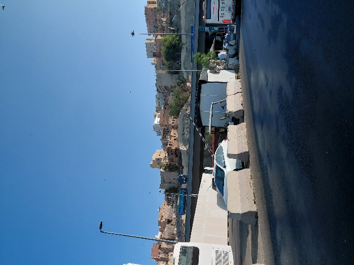 This image captures a daytime urban scene in Makkah Al Mukarramah, Saudi Arabia, under a clear blue sky dotted with small birds. The upper half of the frame reveals a hillside densely covered with multi-story buildings in shades of brown and white. An elevated concrete overpass crosses the mid-ground, featuring two blue trucks on its surface. Below the overpass, an asphalt road in the foreground shows dark, wet-looking patches. A row of light grey concrete barriers separates the road from an inner area. Behind these barriers, a white sedan is parked, and further right, a small white rectangular structure stands near a white golf cart. A white passenger bus with red rear markings is partially visible on the far right. A tall streetlight stands on the left, and a partially obscured one is on the right. A section of a large white building with vertical louvers is visible on the far left. No individuals are present in the visible scene.
