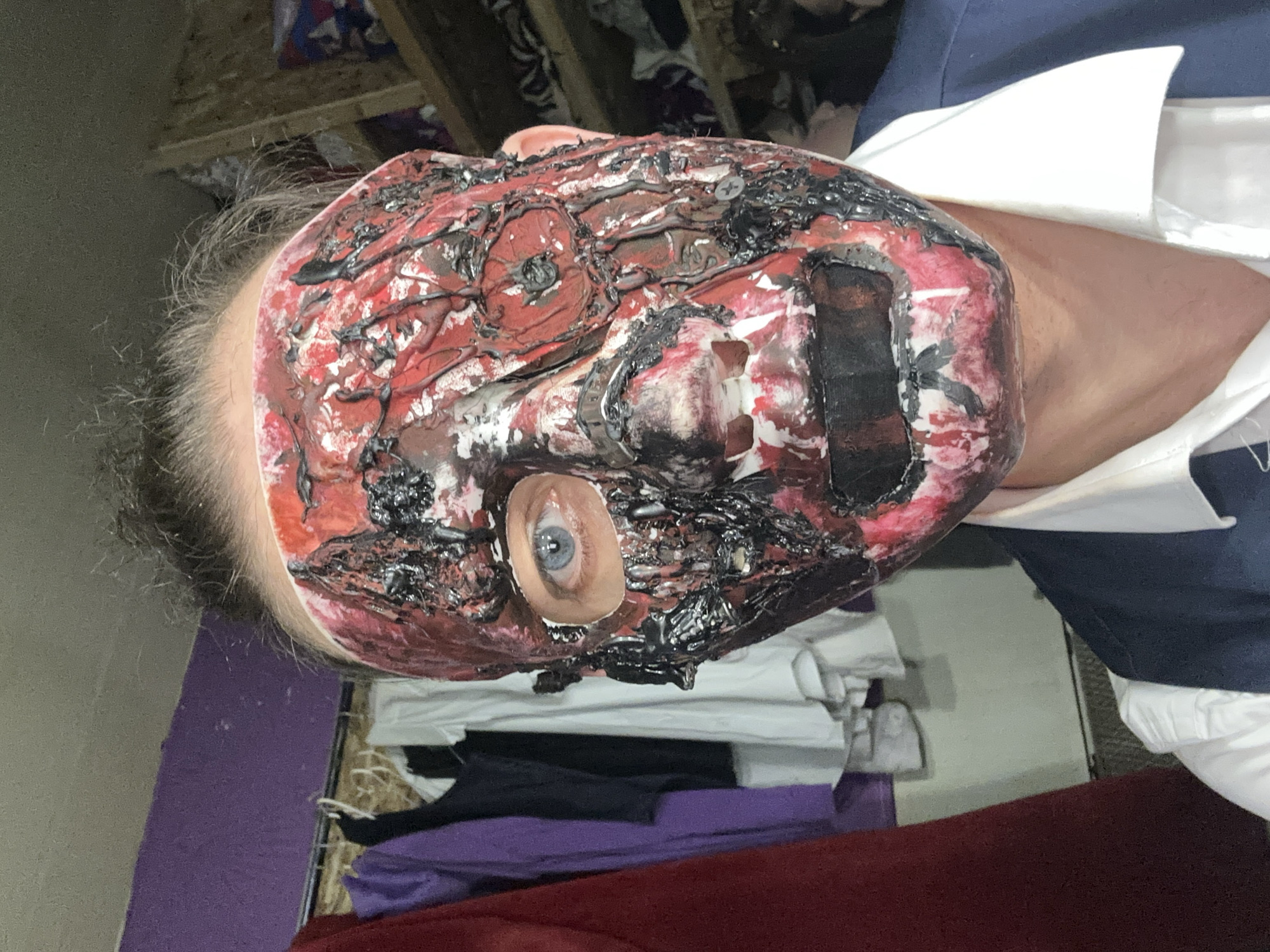 A person wearing a grotesque, scarred, and possibly burned facial mask is seen from an upward angle. The mask is predominantly red and white with black areas suggesting charring. It includes a single exposed blue eye. The person is wearing a white collared shirt and a blue vest or jacket. The background includes a shelf with clothing, a purple object (possibly furniture), and items that appear to be clothes. The location is not discernible from the image provided, so I cannot provide a location within Saratov, Russia.