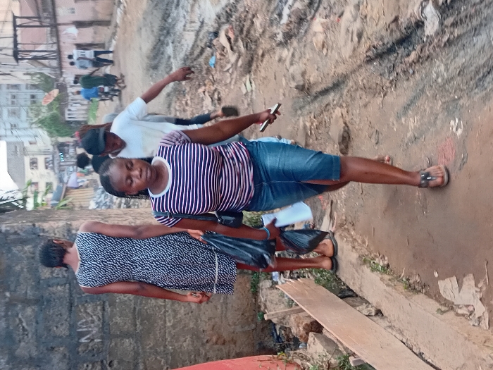 A woman in a striped shirt and denim shorts stands on a dirt road, holding a smartphone. Another woman in a patterned dress walks nearby. A man in a white shirt and cap is slightly behind them, arm raised. The road is lined with debris, and buildings are visible in the background.