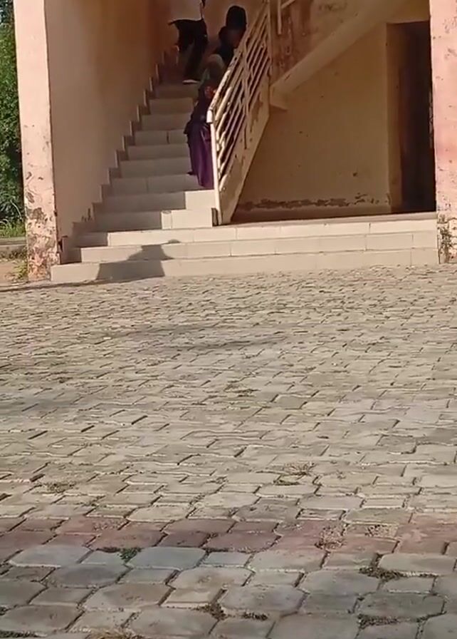 People are on and around stairs leading to a building with a textured gray brick patio. Several people walk up the stairs, one person in a white shirt. Later, two men stand in front of a doorway, one on his phone. Another man is seated by a support pillar, also looking at his phone.