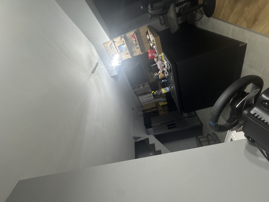 The scene depicts an indoor residential area in Graf Ignatievo, Bulgaria, showcasing a contemporary open-plan kitchen and living space. In the foreground, a black and blue sim racing wheel peripheral with a textured handgrip is prominently positioned. To the left, a light gray wall partially obstructs a visible wooden staircase ascending to an upper level. A large, double-door stainless steel refrigerator is situated against the back wall, adjacent to a black kitchen island featuring a light-toned countertop. Miscellaneous items, including a yellow bottle, keys, and a small white box with red text, are arranged on the island's surface. Behind the island, a wooden shelving unit is affixed to the wall, displaying various objects and possibly books. A dark, rectangular screen, likely a television, is partially visible on the far right wall. Two dark-seated bar stools are situated near the kitchen island. The ceiling is white, equipped with a modern, linear light fixture centrally illuminating the space. The flooring transitions from light gray tiles near the kitchen island to a darker wooden floor. No individuals are present in the image.