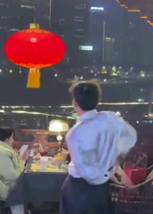 person in a white shirt and dark skirt holding a long-handled utensil, possibly a brush or cleaning tool, and twirling it overhead in a restaurant. Other patrons are seated at tables nearby, some looking at their phones. A large red lantern hangs in the background, along with signage in Chinese characters and a distant cityscape with bright lights. The scene appears to be at night, with ambient light creating a slightly blurry image.