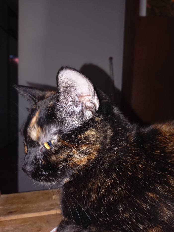 The image portrays a tortoiseshell cat, exhibiting a coat predominantly of black and dark brown fur with distinct patches of orange-gold. The feline is presented in profile, facing towards the left of the frame, with its head slightly angled. Its right ear is clearly visible, revealing light gray fur within its interior. The cat's eyes are open, displaying a yellow-gold hue, and are fixed on an area to its left. Intact whiskers extend from its muzzle. The animal is situated on a light brown wooden surface, characterized by horizontal grain patterns. The background consists of a dark gray wall on the left, upon which a shadow from the cat's head is cast, and a darker brown surface on the right, where a thin, light-colored vertical object is faintly discernible. The scene is illuminated by artificial light, indicative of an indoor setting. This event takes place within a residence in the city of Buenos Aires, Argentina.