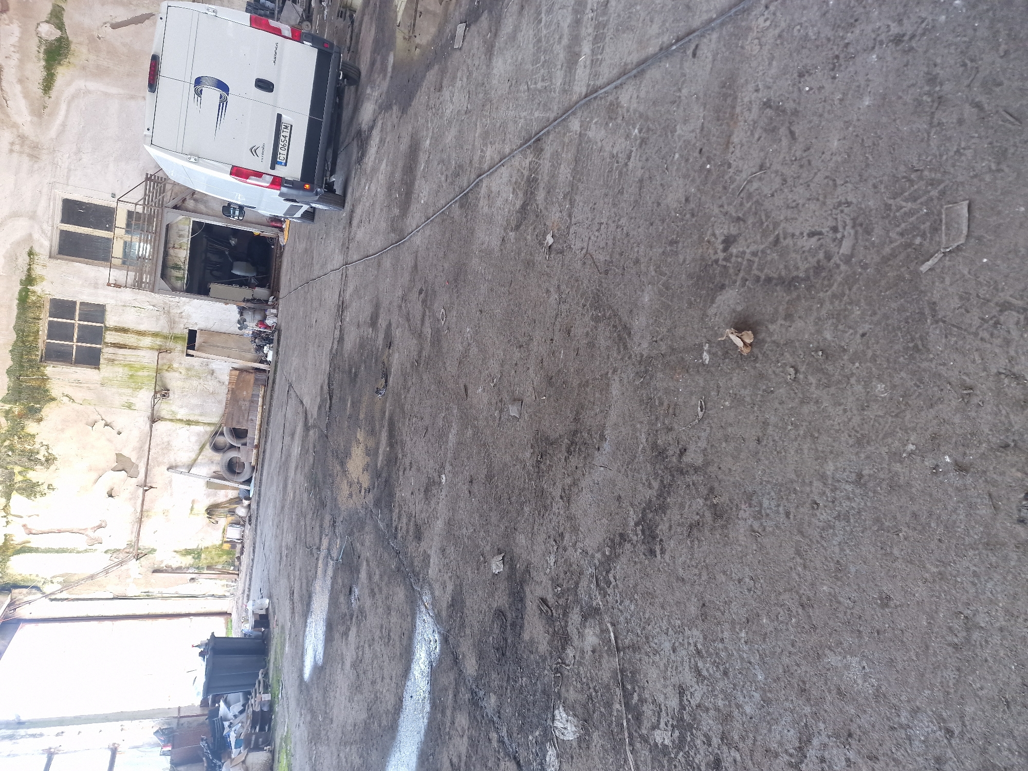partially enclosed area with a white van parked near an entrance. The license plate of the van is visible and reads "CT 0654 TM". The area surrounding the van consists of a worn concrete surface with visible tire marks and debris. To the left, there's a building with peeling paint and visible brickwork. The location seems to be an industrial or commercial area. The city and country are unknown.