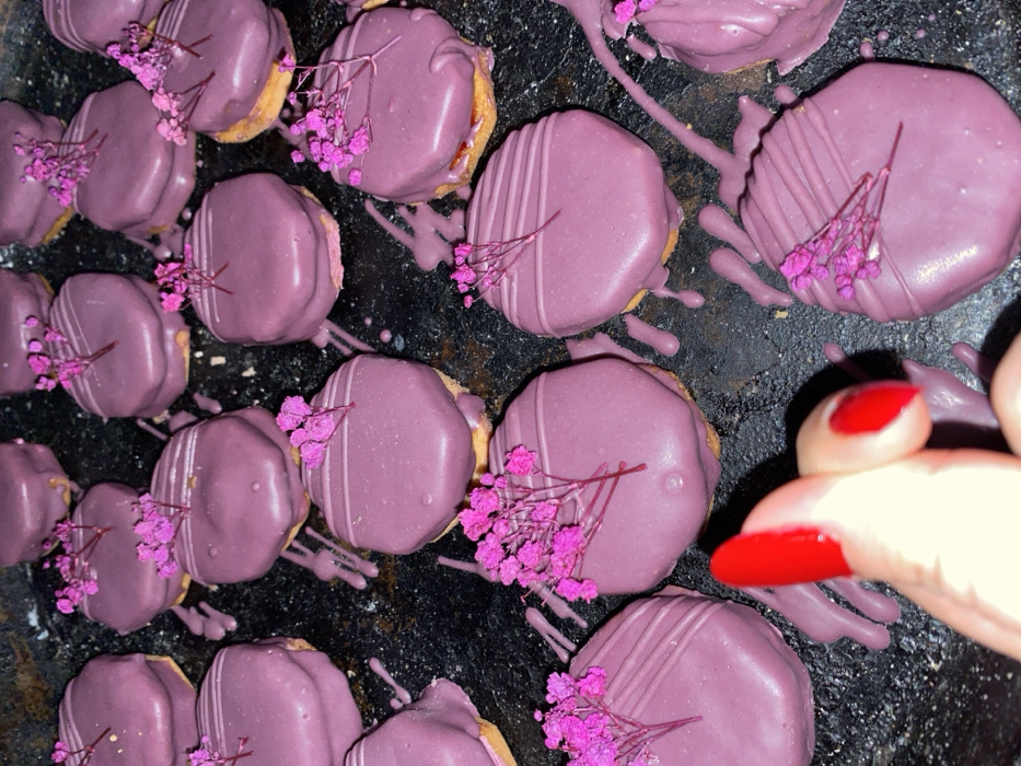 An overhead view captures approximately 18-20 circular confections arranged on a dark, textured surface, identified as a baking tray or dark countertop, at an unspecified indoor location in Unknown, Unknown. Each confection is coated uniformly in a mauve-colored glaze. Several confections display three to four thin, parallel lines of a slightly lighter purple drizzle. A small cluster of dried, fuchsia-pink flowers is centrally placed atop almost every confection. Excess glaze has dripped onto the dark surface, forming irregular pools and streaks between the confections. In the lower-left quadrant, a human hand with red-polished fingernails (thumb and forefinger visible) is positioned over one of the confections, indicating recent or impending interaction. The lighting is consistent with an interior setting.