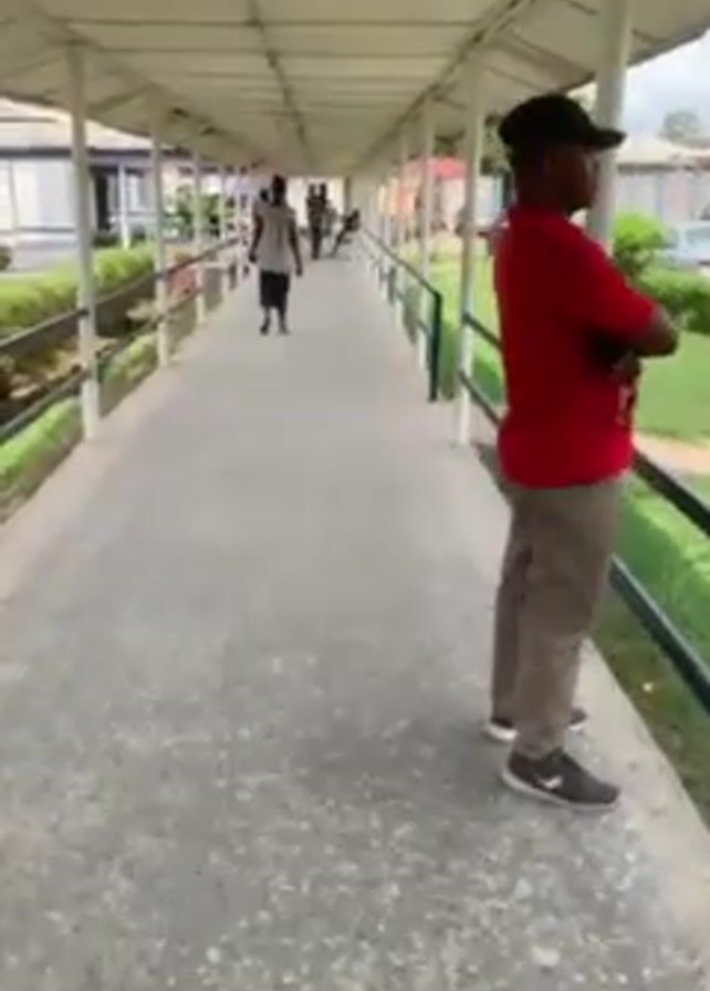 n outdoor covered walkway, likely part of a hospital complex or similar institution. The walkway has a white roof supported by white columns, and a gray speckled floor. Black railings line the sides of the walkway, with grassy areas visible on one side. Several people are walking along the walkway in both directions. A man wearing a red shirt, khaki pants, and a black baseball cap stands near the railing with his arms crossed, looking out at the grassy area. Parked cars are visible in the background. The video seems to be taken from the perspective of someone walking along the walkway.