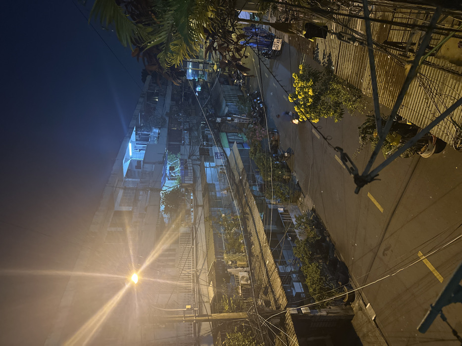 The nighttime image displays a tall building lit by a streetlight, with a street winding along its side. The building has multiple floors and numerous balconies filled with vegetation. Power lines crisscross the sky. The street has potted plants, parked motorbikes, and lane markings. A section of foliage hangs overhead, partially obscuring the street. The streetlight casts a bright, hazy glow.