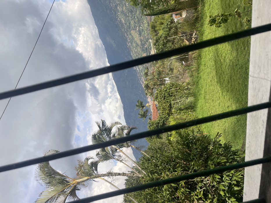 A view through window bars reveals a lush, green landscape. Palm trees dominate the foreground. Beyond, a mountain range rises, partially obscured by cloudy skies. Patches of vegetation dot the mountain's slopes. A house with a red tile roof nestles among the trees. A vibrant green lawn extends from the bottom right, completing the scene.