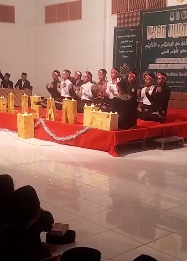 In a medium shot of an indoor scene, several people are seated on a red-draped stage, facing an audience. On the left, a table is set with microphones, suggesting a speaking area. In the center, eight people are seated in a row, wearing traditional outfits consisting of white shirts, dark pants, and distinctive red and brown headwear. They are positioned behind large, golden block letters spelling out "LASA." Each letter has small, flickering candles placed on top. The individuals are either clapping or holding their hands together in front of their chests. A large sign, partially obscured, hangs in the background, featuring Arabic script and English text that includes phrases like "Achievement and Noble" and "The future." The audience, seated in front of the stage, consists mainly of people wearing black caps. The environment appears to be a large hall with tiled floors and white walls.