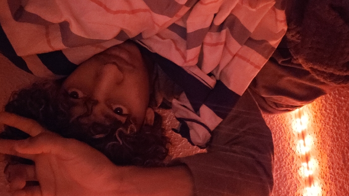 The image depicts a single individual, appearing to be a young male, positioned in an indoor setting. The subject has dark, curly hair and is partially reclined, looking directly at the camera. He is covered from the lower chest downwards by a blanket featuring red, white, and dark stripes. His right hand is raised and rests above his head, with fingers slightly spread. A secondary, dark-colored, textured fabric object is visible to the left of the subject. The environment is illuminated by a predominant red light originating from a vertical strip, consistent with LED lighting, positioned along a textured wall in the background on the left. This indoor scene, likely a private room, is located within the city of Kamenz - Kamjenc, Germany; however, the precise location within the city cannot be determined from the visual evidence.