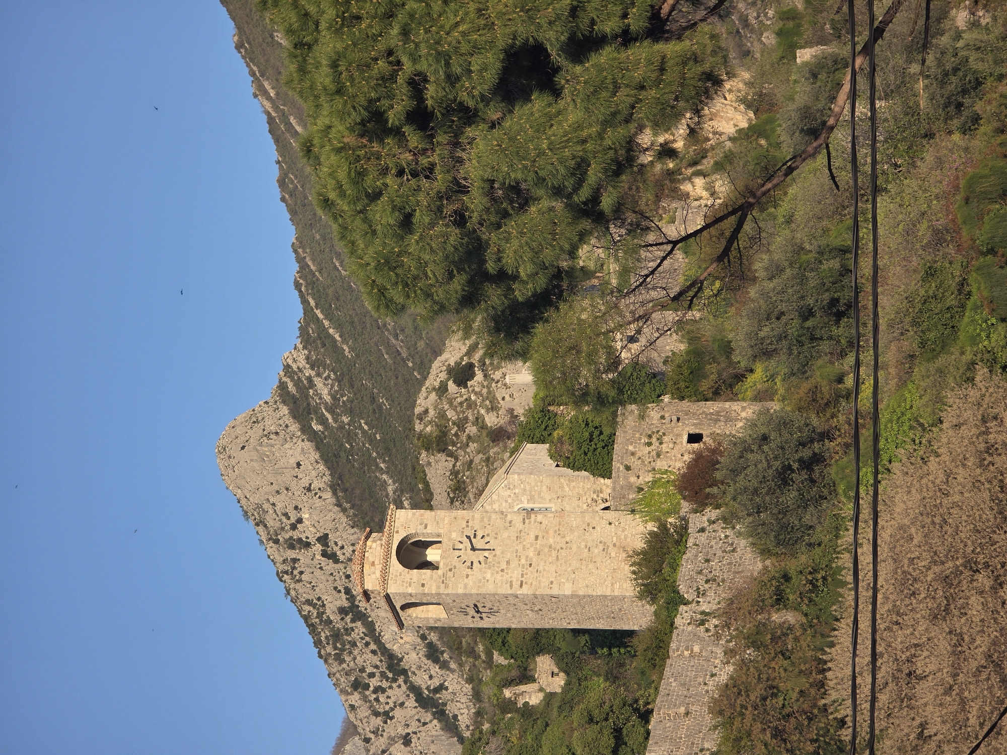 n exterior daytime view of a stone clock tower in the city of Stari Bar, Montenegro. The tower, positioned prominently, has a clock face and an archway near the top. The tower is surrounded by green vegetation, part of a wall, and a mountainside. Wires are visible in the right foreground. The sky is blue.