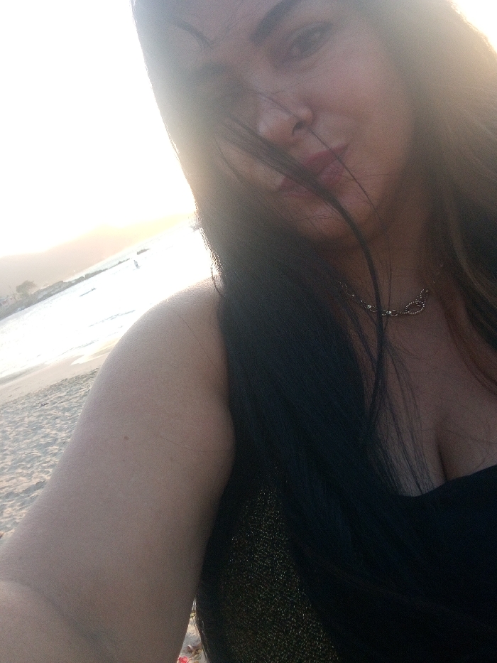 The image depicts a lone female subject captured in a selfie on a beach in Juan Griego, Venezuela