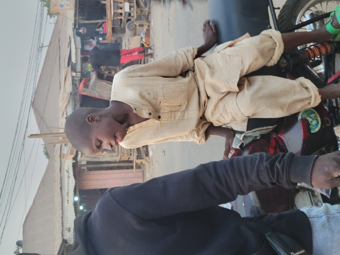 A child in a tan outfit lies prone on a motorcycle seat, the bike angled to the right in the frame. A person in a black jacket and blue jeans sits in the foreground. The background shows a bustling street scene with people, buildings, and assorted structures, including a stall with red fabric. The scene appears to be shot in daylight, with details visible but some areas slightly blurred due to depth of field.