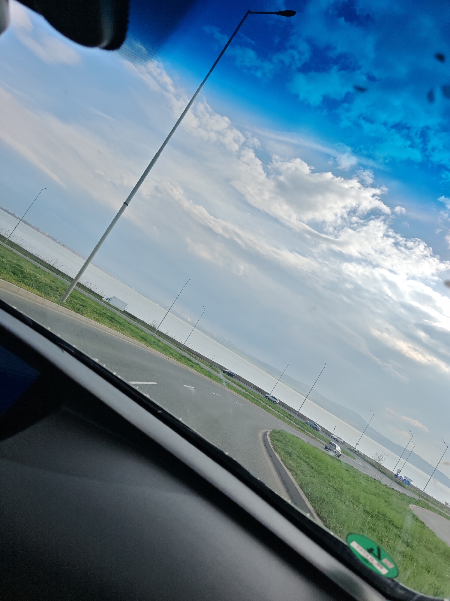 The image, taken from inside a vehicle, shows a road curving to the right with a grassy median. Several cars are visible on the road, including one that appears to be silver. The background features a large body of water, possibly the Black Sea, and a cloudy sky. Streetlights line the road. The location is likely in Burgas, Bulgaria, given the landscape and presence of the Black Sea. The overall scene is a road trip or commute along a coastal route.