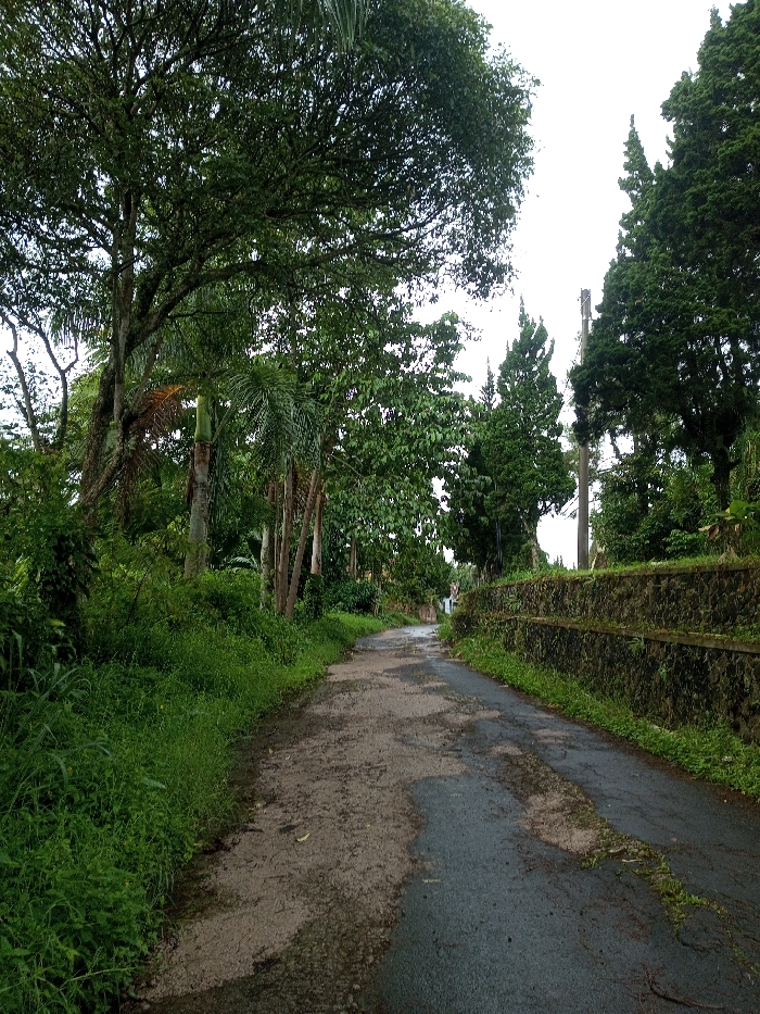 A narrow, cracked asphalt road stretches into the distance, flanked by dense foliage. Lush green grass and overgrown vegetation line the left side of the road, while a stone retaining wall covered in moss and plants runs along the right. Tall trees with thick canopies create a shaded environment. A few palm trees are visible amidst the other trees. The overcast sky suggests a humid or rainy climate. The scene evokes a sense of tranquility and seclusion.