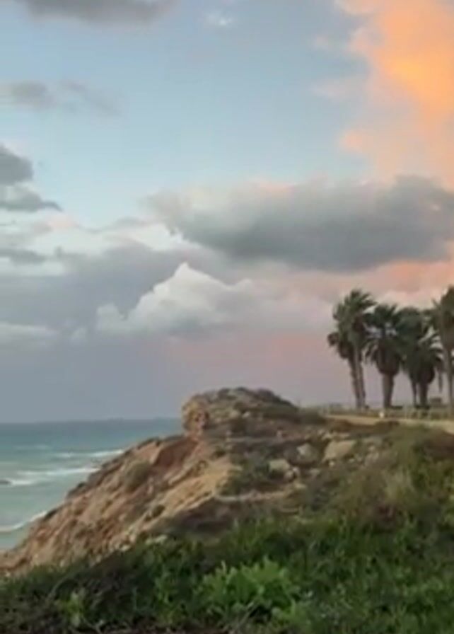 The video showcases a picturesque coastal scene. A grassy cliff overlooks a turquoise sea with breaking waves. A small breakwater is visible in the distance. The sky above is filled with dramatic clouds, tinged with hues of pink and orange from the setting sun. Palm trees stand tall on the cliff's edge. The camera pans slightly, revealing more of the seascape. There are no people visible in the frame.