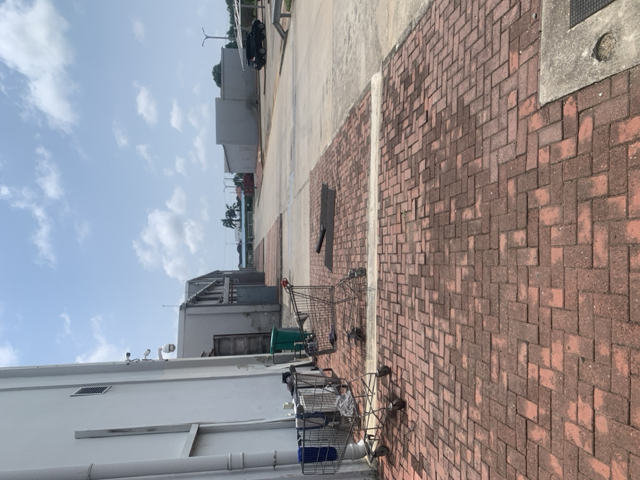 The image displays an outdoor scene in Sangotedo, Nigeria, under a bright, partly cloudy sky. In the foreground, a red brick pavement, laid in a herringbone pattern, extends across the frame, showing areas of darker discoloration. Two metal shopping carts are positioned on this pavement. The cart on the left contains a blue fabric item and other unidentifiable objects. The cart on the right is partially tipped on its side and appears empty. Adjacent to these carts is a green cylindrical trash bin. To the immediate left, a light-colored building with vertical paneling is visible, featuring a rectangular ventilation grate and three mounted security cameras (two dome-style and one bullet-style). Partially obscured behind the trash bin and building is a brown shipping container. A concrete curb separates the brick pavement from an asphalt roadway to the right. Along this roadway in the midground, a black SUV is parked under a simple overhead shelter. Additional light-colored buildings, utility poles, and palm trees are visible in the background. No individuals are present in the scene. The overall lighting suggests midday.