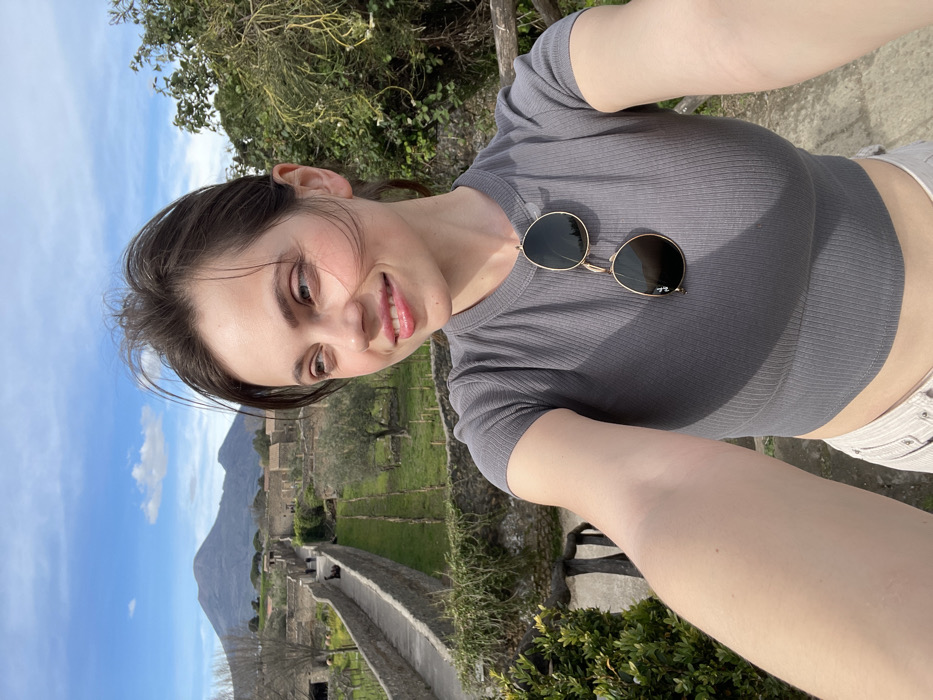 A young adult female is depicted in a selfie, positioned in the foreground of an outdoor scene within the archaeological site of Pompeii, Italy