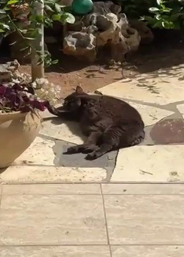 dark-brown cat laying on a beige tiled patio in a sunbeam. The cat is on its side and appears to be grooming or scratching its face with one paw. Behind the cat is a garden area with various plants, flowers, and decorative objects including a small stone structure with a green ball on top and a ceramic planter containing red and white flowers. A white column or wall is visible to the left of the frame, partially obscuring the scene. The overall setting is a sunny outdoor space.