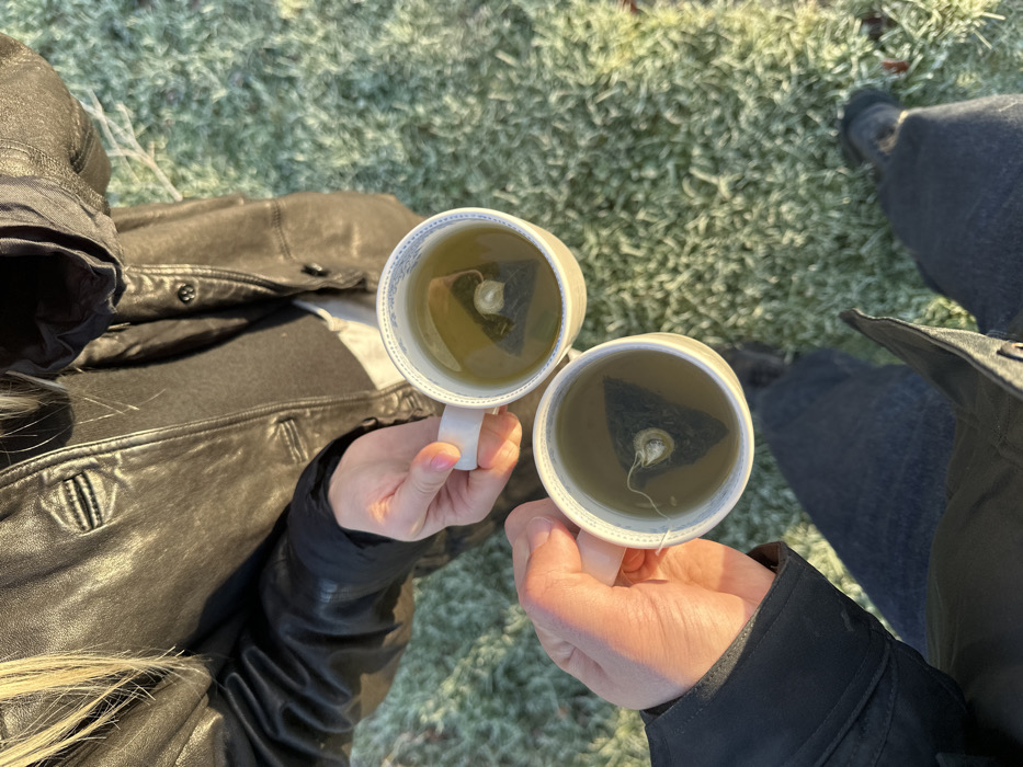 Two individuals are depicted from an overhead perspective, standing outdoors in East Suffolk, United Kingdom, on ground covered in frosted grass. One individual, positioned lower in the frame and wearing a dark coat over blue jeans, holds a white ceramic mug with their left hand. The mug contains a light-colored liquid with a submerged pyramidal tea bag. The second individual, positioned higher in the frame and wearing a dark leather jacket, holds an identical white ceramic mug with their right hand, which has pink nail polish. This mug also contains a light-colored liquid with a submerged pyramidal tea bag. Blonde hair is visible over the shoulder of the second individual. Low-angle sunlight illuminates the scene from the left.