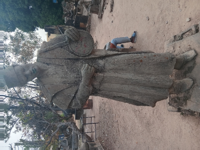 A weathered, concrete statue stands prominently on a sandy ground. The statue depicts a person wearing a hat and robes, holding a circular object. Part of another person wearing pants and blue sandals is visible behind the statue. The statue is surrounded by trees, other statues, and some metal railings. The statue appears worn and aged, adding to the overall historical or artistic ambiance.