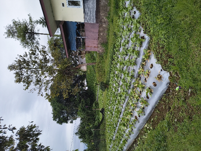 The scene is an outdoor view of an agricultural area adjacent to a structure, located in Unknown, Vietnam, under an overcast sky