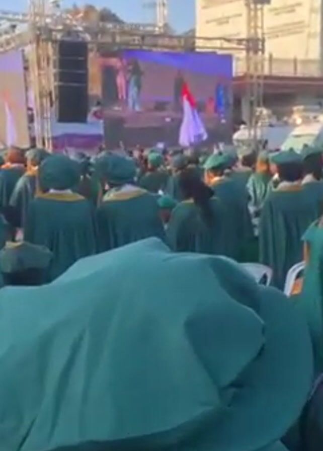 A large group of people dressed in green graduation gowns and hats face a stage with a large screen in an outdoor setting. Two figures are visible on the screen: a woman in a blue dress and a man in a suit, both holding microphones. The stage is set up with scaffolding and speakers, and a tall building is visible in the background. The atmosphere appears to be celebratory, likely a graduation ceremony.