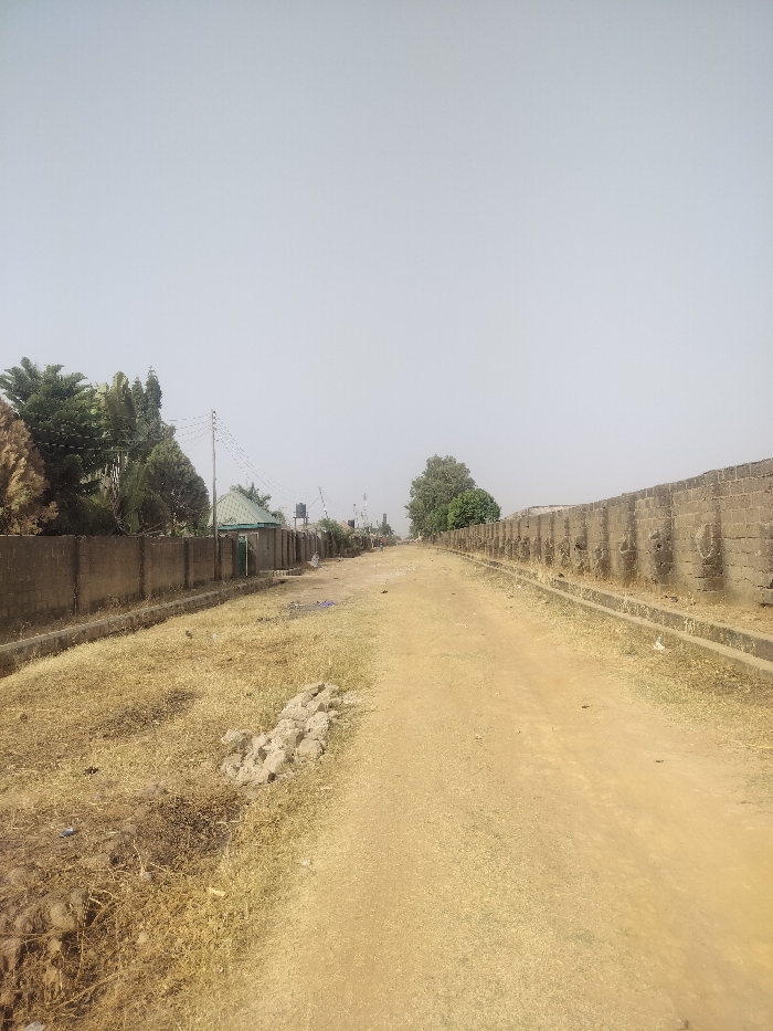 The image depicts an unpaved, light brown dirt road extending into the distance under a clear, hazy light grey sky in Sabon Tasha, Nigeria