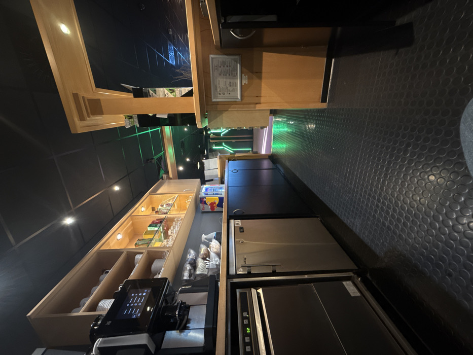 The scene depicts an interior view of a commercial establishment, identified as being located in Remscheid, Germany. The area appears to be a modern bar or serving station, characterized by clean lines and functional design, devoid of any individuals. The floor is covered with dark, studded rubber matting that extends from the immediate foreground into the midground. The ceiling is black, featuring multiple recessed spotlights that cast localized illumination. On the left side of the frame, a wooden countertop runs horizontally. Positioned on this counter is a prominent black and silver WMF brand coffee machine, equipped with a digital touchscreen display. Above the counter, light-colored wooden wall cabinets are mounted. The upper shelf holds stacks of white ceramic plates and mugs. The lower, illuminated shelf showcases an assortment of packaged goods (likely teas or beverages) and rows of clear glasses. On the countertop itself, several clear bowls contain various snack items, a white spray bottle is present, and multiple Red Bull cans are visible. Beneath the counter, from left to right, a stainless steel commercial dishwasher displaying "52" is installed, followed by a stainless steel under-counter refrigerator unit labeled "K1", and a series of dark-colored base cabinets with handles. On the right side of the frame, a substantial light-colored wooden structural pillar stands vertically, bordering a dark, reflective wall panel that subtly reflects green light from the background. A wooden counter extends towards the foreground, upon which a white framed notice board containing illegible text is mounted. A dark cabinet or appliance is partially visible to the far right. In the background, a passageway or open doorway reveals an area intensely lit with green ambient lighting, highlighting the floor and vertical structural elements, suggesting an adjoining lounge or entertainment space.