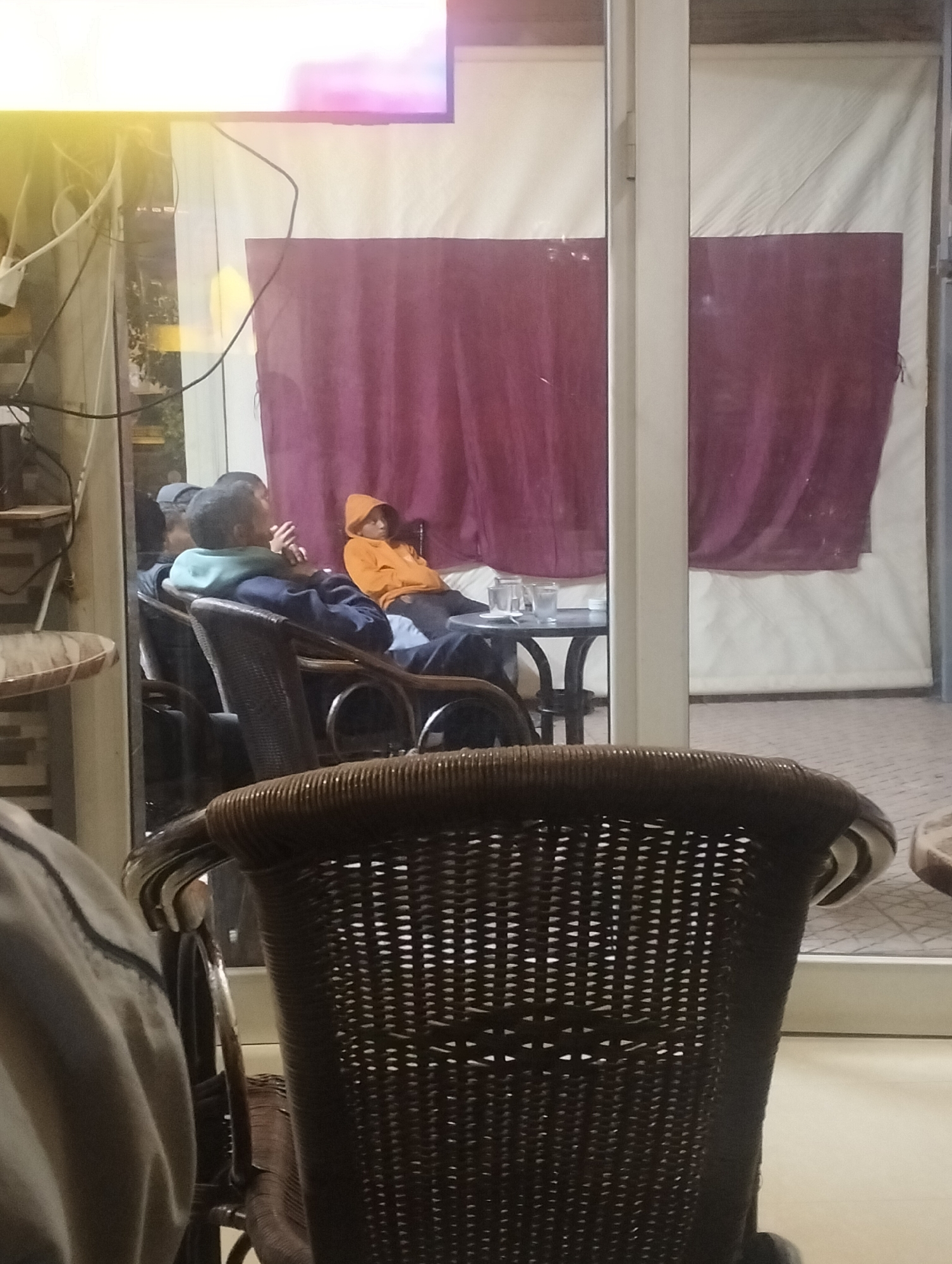 The image depicts an interior scene, likely a cafe or restaurant in Ouaouizert, Morocco, viewed through a clear glass partition from an adjacent seating area. In the immediate foreground, the back of a dark brown woven wicker chair partially obscures the lower right, and a person's shoulder in a light grey garment is visible on the far left. Beyond the glass partition, three individuals are seated in a relaxed environment. On the left, a person wearing a dark blue jacket over a light blue/teal hoodie is seated in a wicker chair, facing right with hands clasped near their chin. To their right and slightly behind, another individual in a bright orange hooded sweatshirt is seated on a light-colored bench or sofa, facing left with their head tilted downward. A third person, wearing a dark cap, is partially visible behind the first individual. A small, round, dark table stands between the seated group, holding at least two clear drinking glasses. The background features a large, horizontally oriented flat-screen television mounted high on the wall, displaying bright, blurred pink and white hues. Below the television and extending to the right, a dark red/maroon curtain covers the lower section of a wall or partition, while the upper section is light cream or white. Wires are visible hanging near the television on the left. The floor beyond the partition appears to be light-colored pavers, possibly a courtyard or patio area. Dark, blurred foliage is visible through the window on the far left.